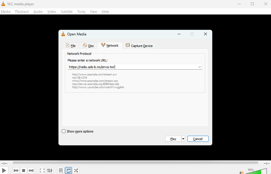 Ønsker du å høre i en ekstern mediespiller, f.eks VLC, så høyreklikker du på lenken, velger kopier lenke og limer denne inn i mediespilleren.